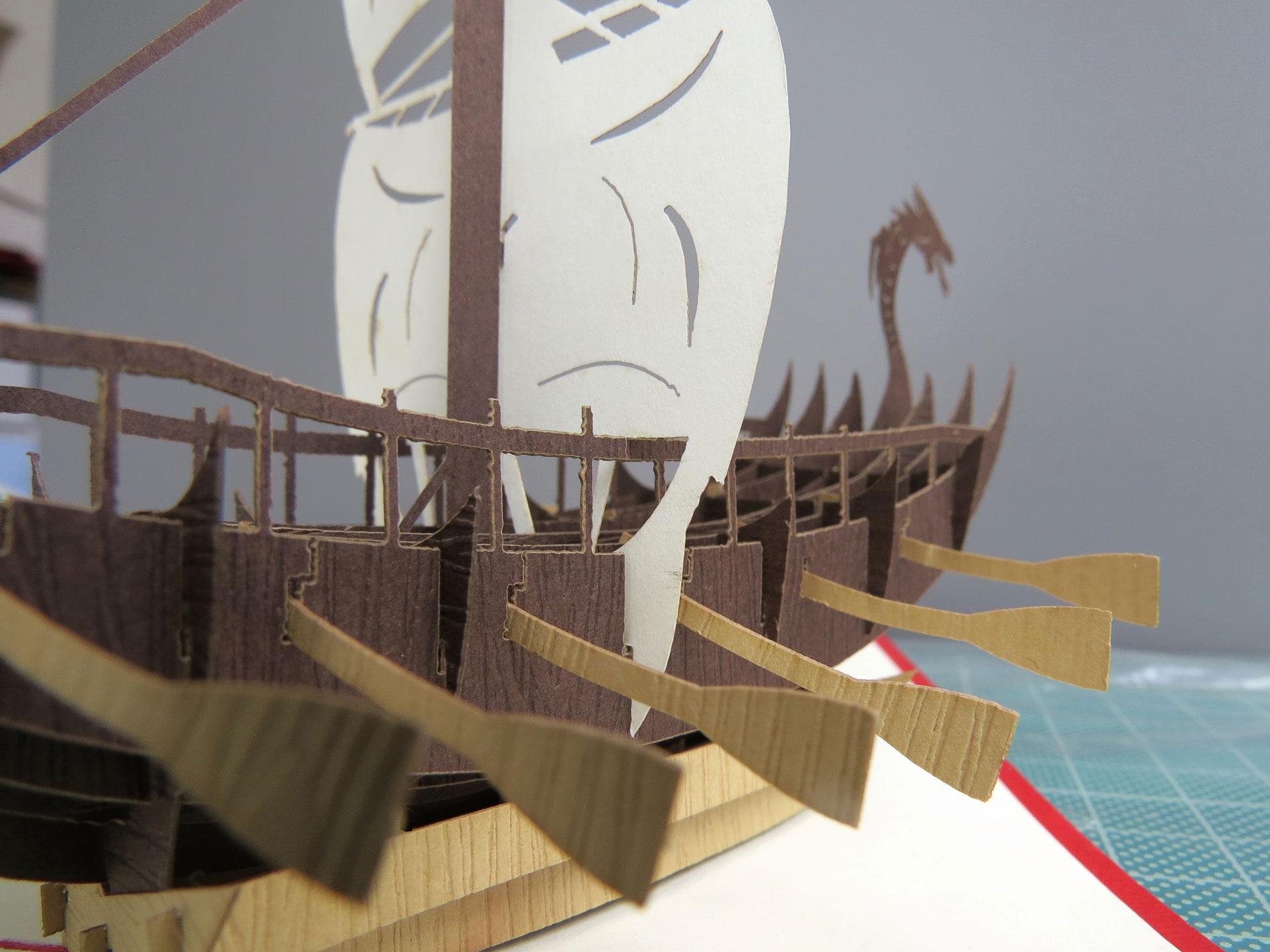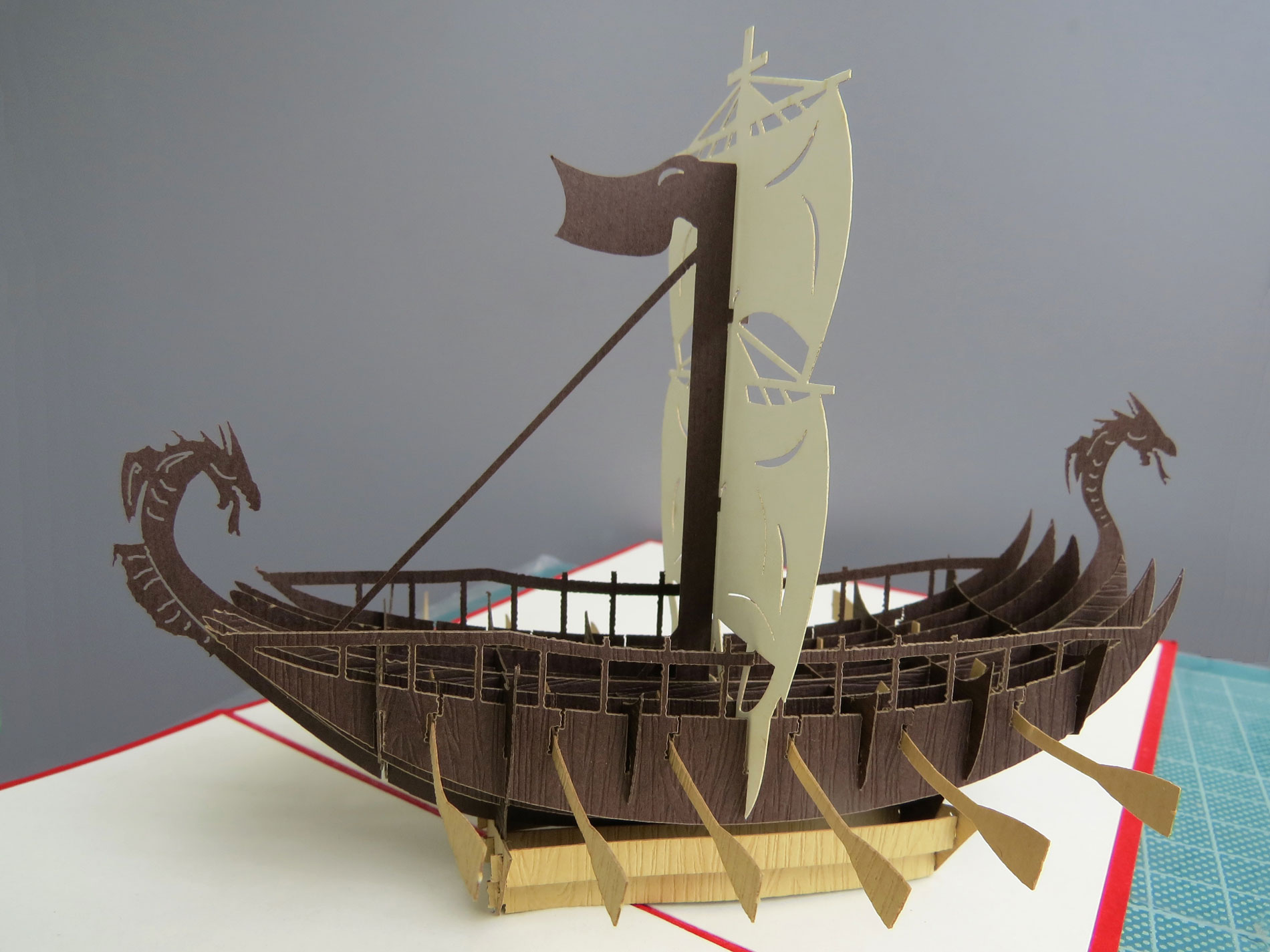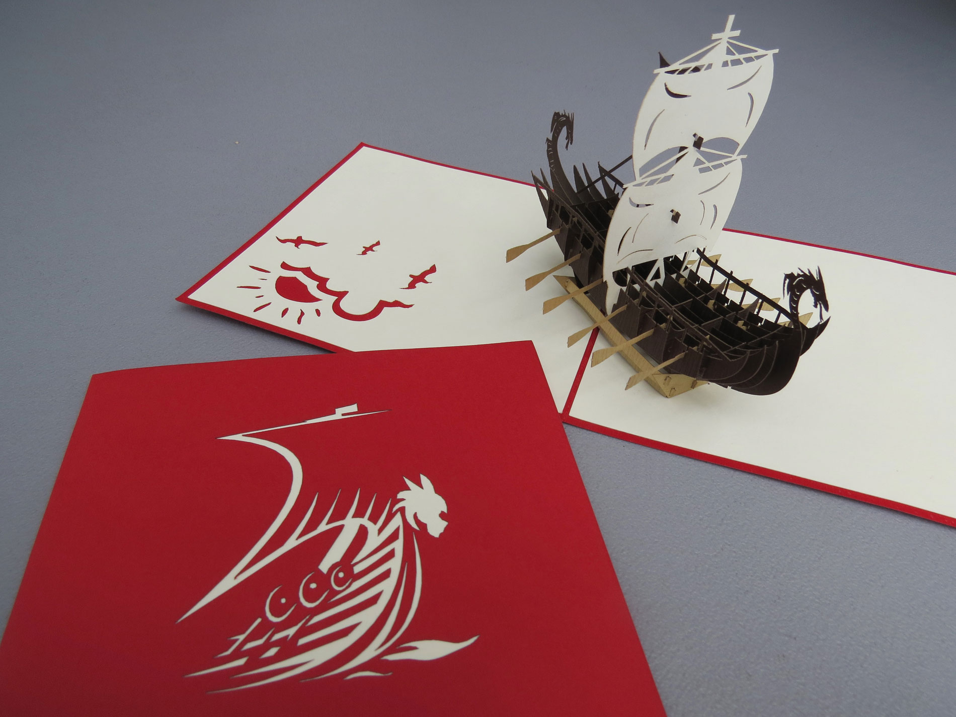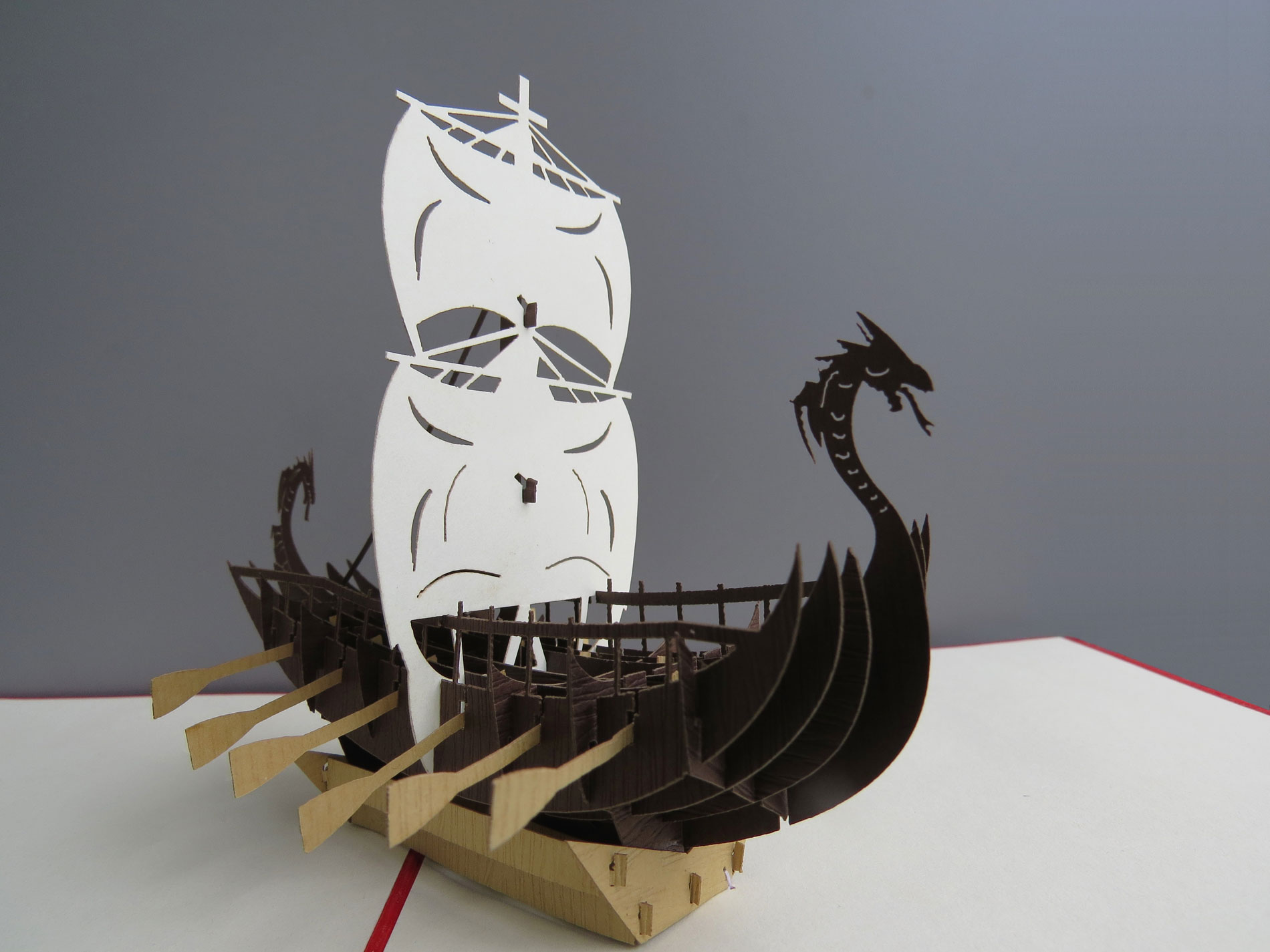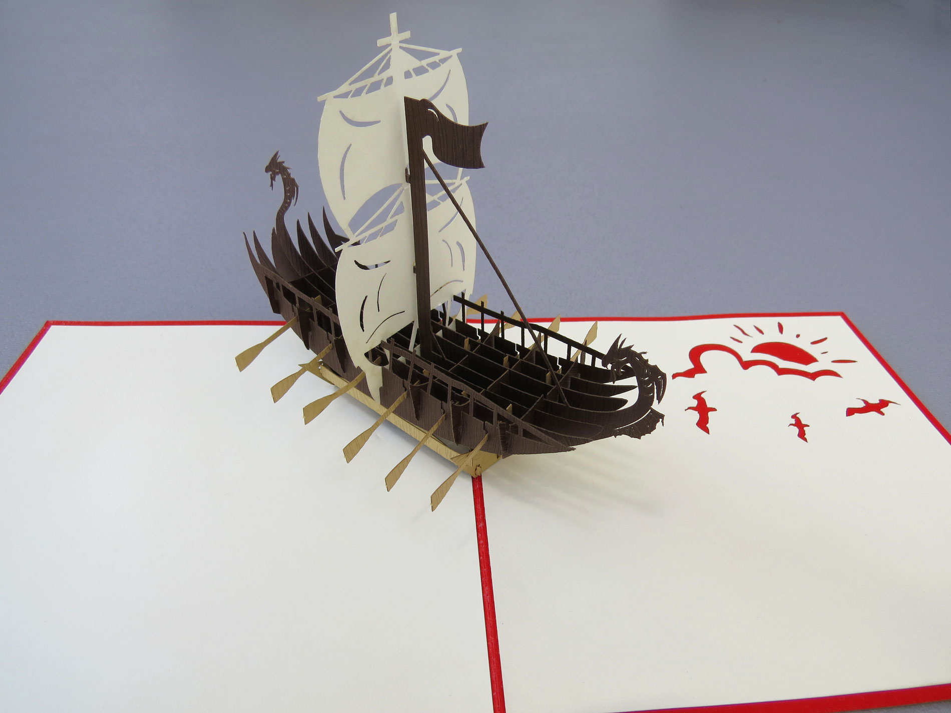 Esta fascinante tarjeta pop-up rinde homenaje a la intrépida historia de los vikingos y sus emblemáticos barcos. En el centro de la tarjeta, un detallado barco vikingo se yergue majestuosamente, con su proa esculpida y velas ondeando al viento.
