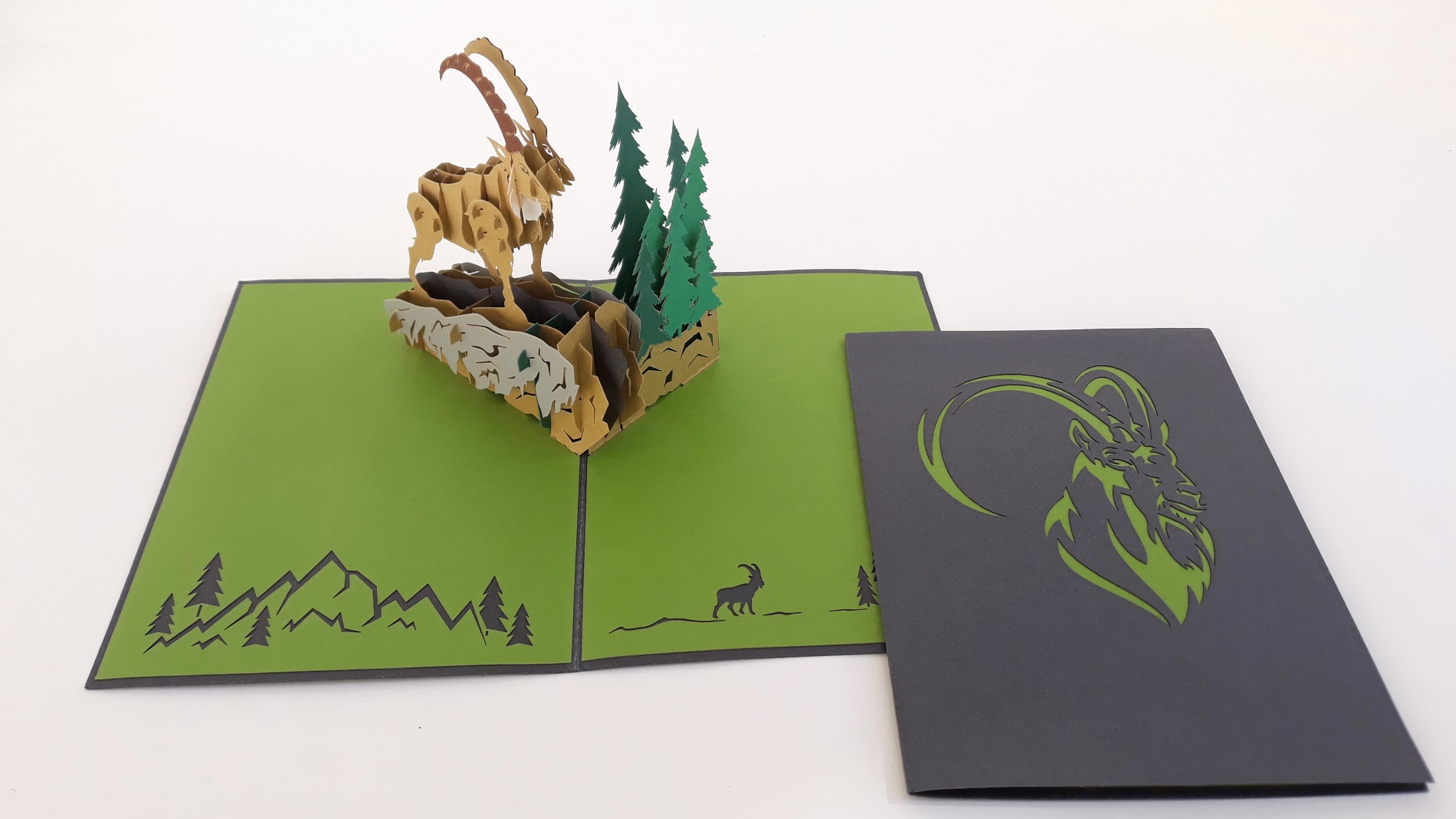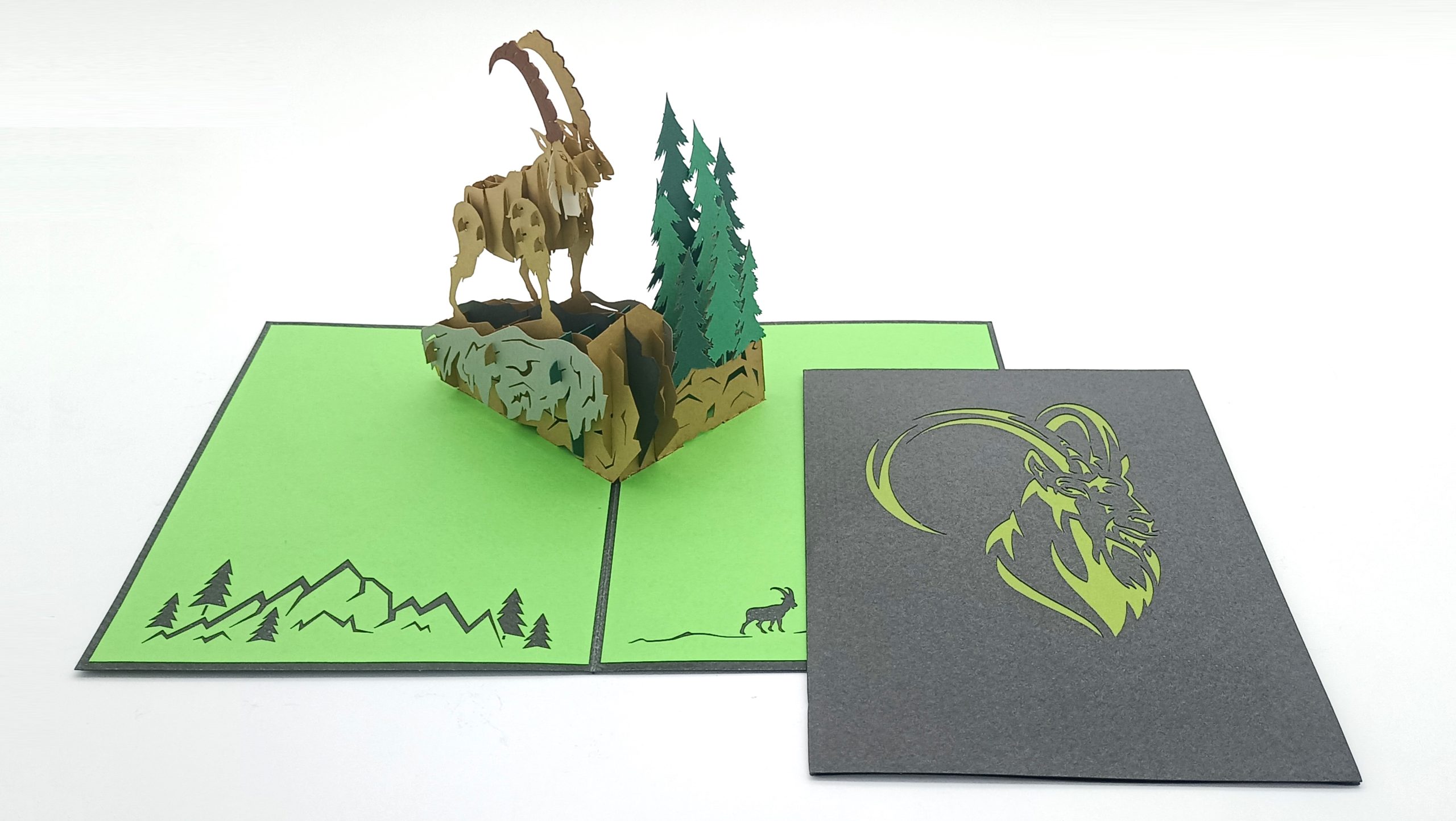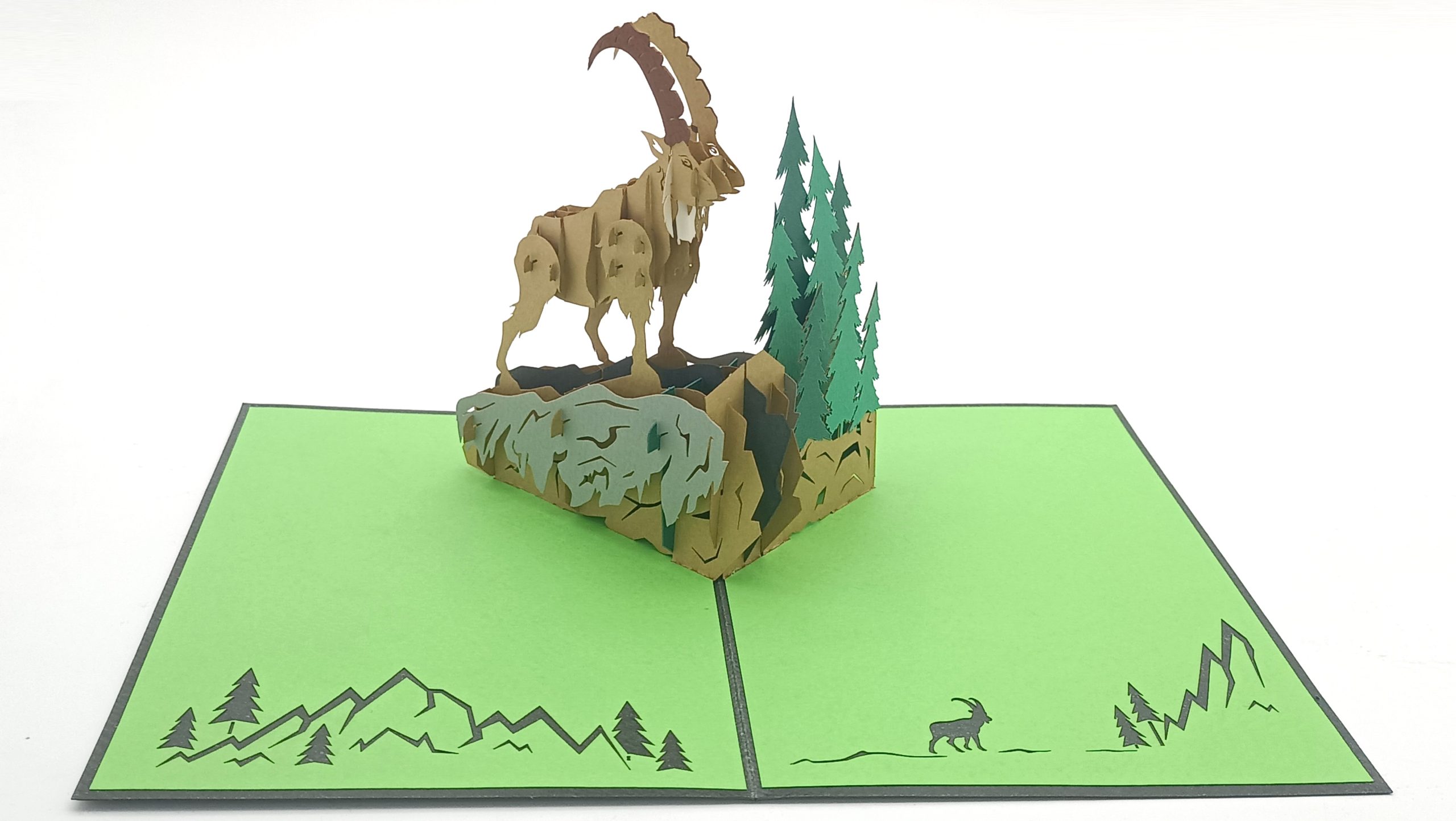 Esta serena tarjeta captura la majestuosidad de la naturaleza con la representación de una cabra montesa, con imponentes astas, sobre unas rocas montañosas. En el fondo, se extiende un bosque de pinos, creando una escena que refleja la belleza y la grandiosidad de los paisajes montañosos.