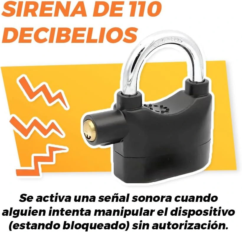 Candado moto con alarma integrada de 110 db, ideal para poder aparcar la moto en cualquier lugar e incluso dejarla en la calle por las noches, con la tranquilidad de que sabes que si alguien intenta robarla, el candado comenzará a pitar con una alto sonido, alarmando así a vecinos y transeuntes.