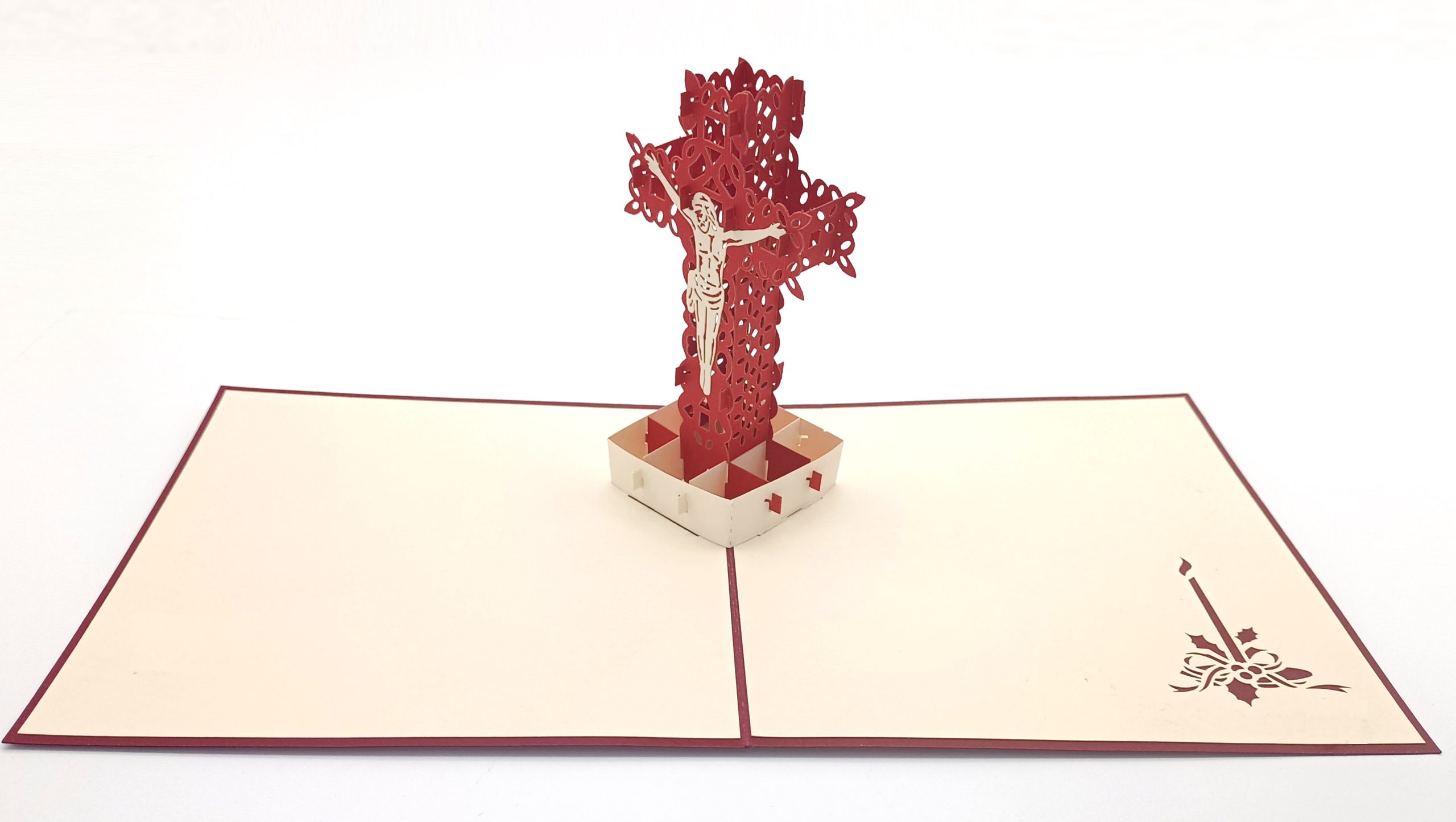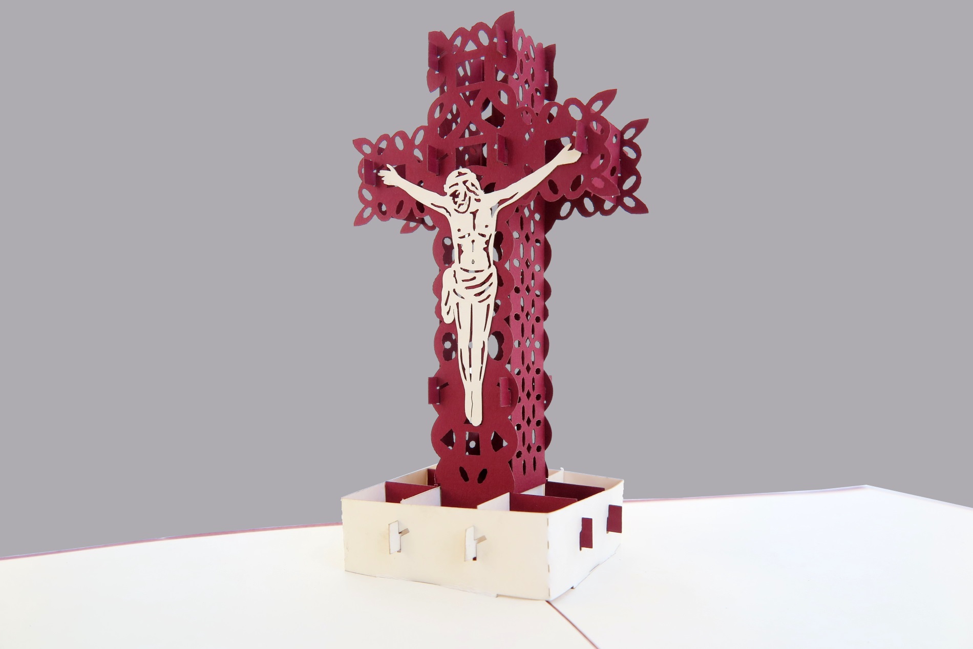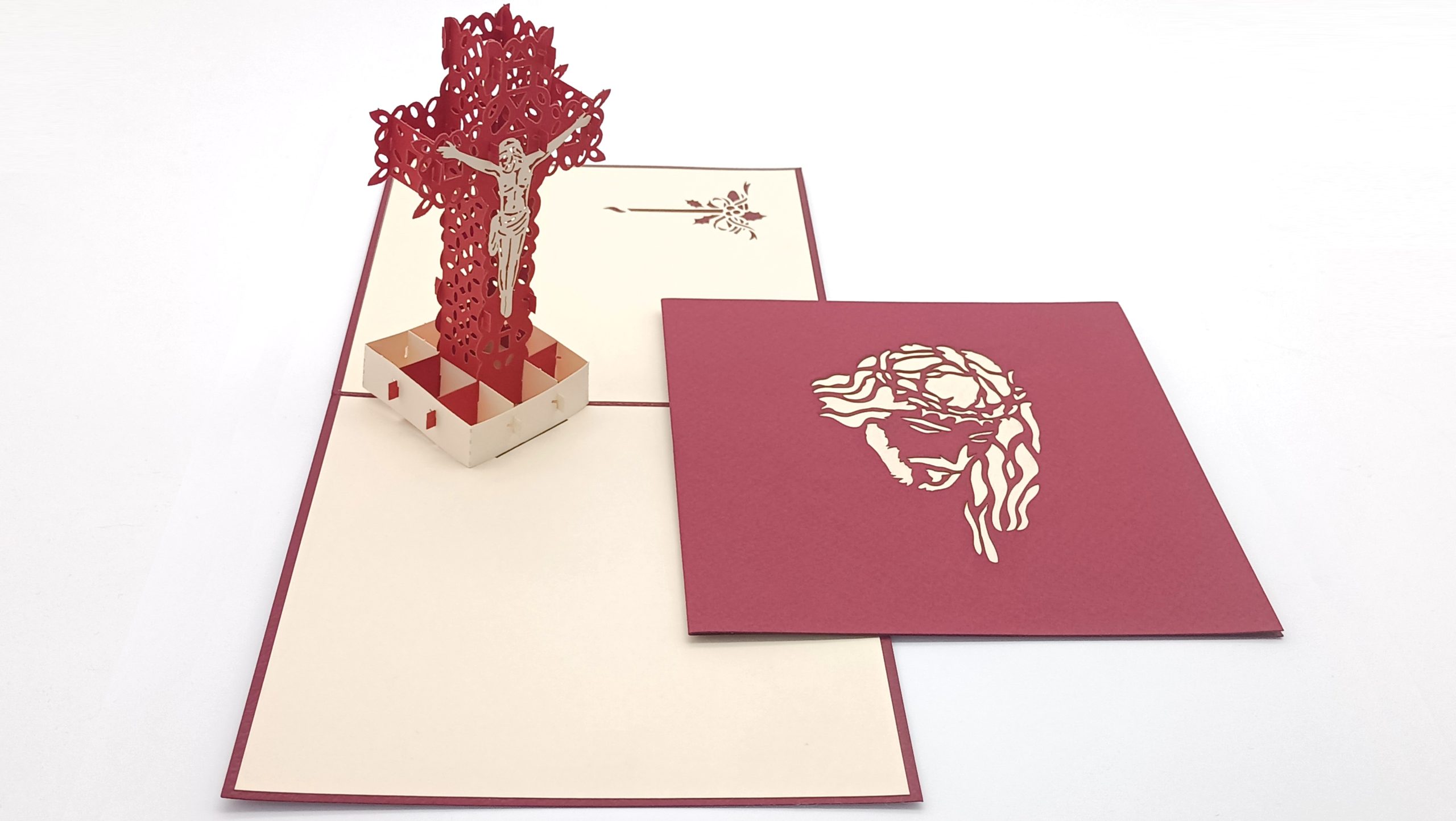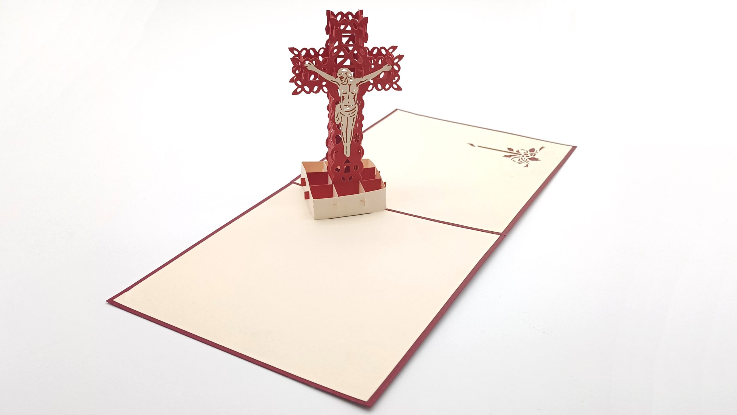 Esta tarjeta es una representación profundamente simbólica de Jesús crucificado. La cruz troquelada, con su tono burdeos intenso, destaca la silueta blanca de Cristo en un acto de sacrificio que tiene una importancia central en la religión católica.