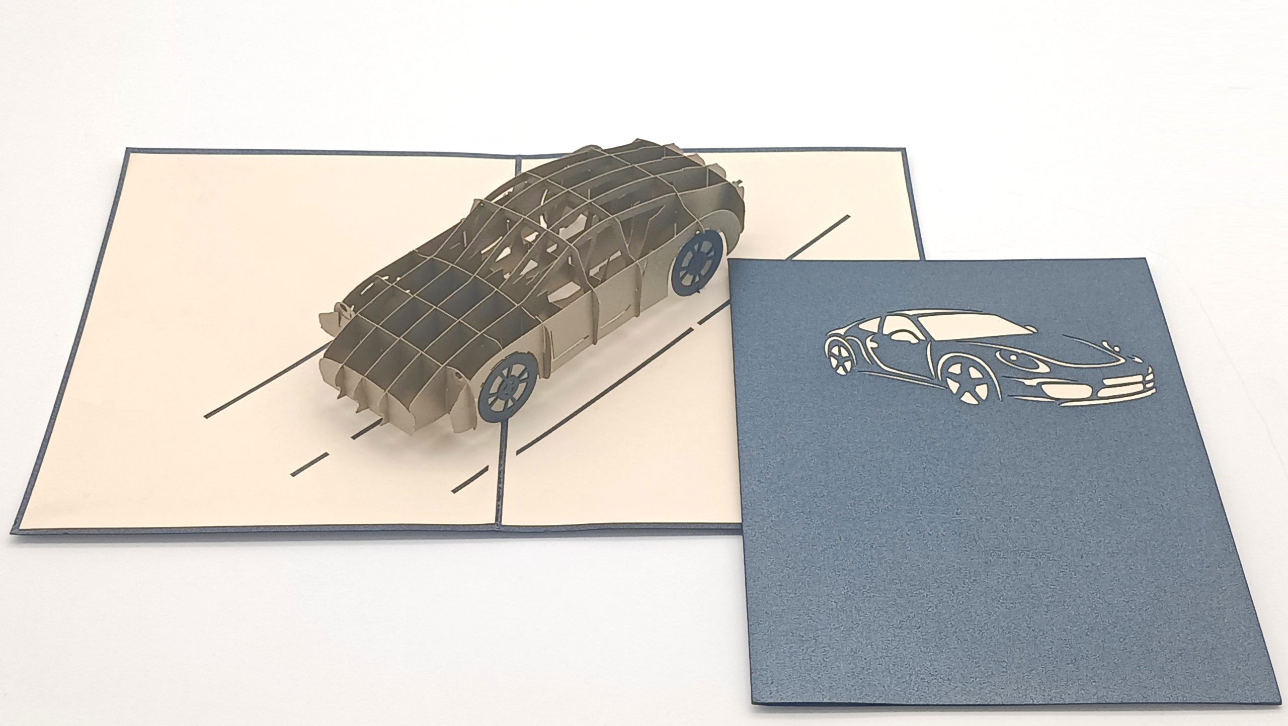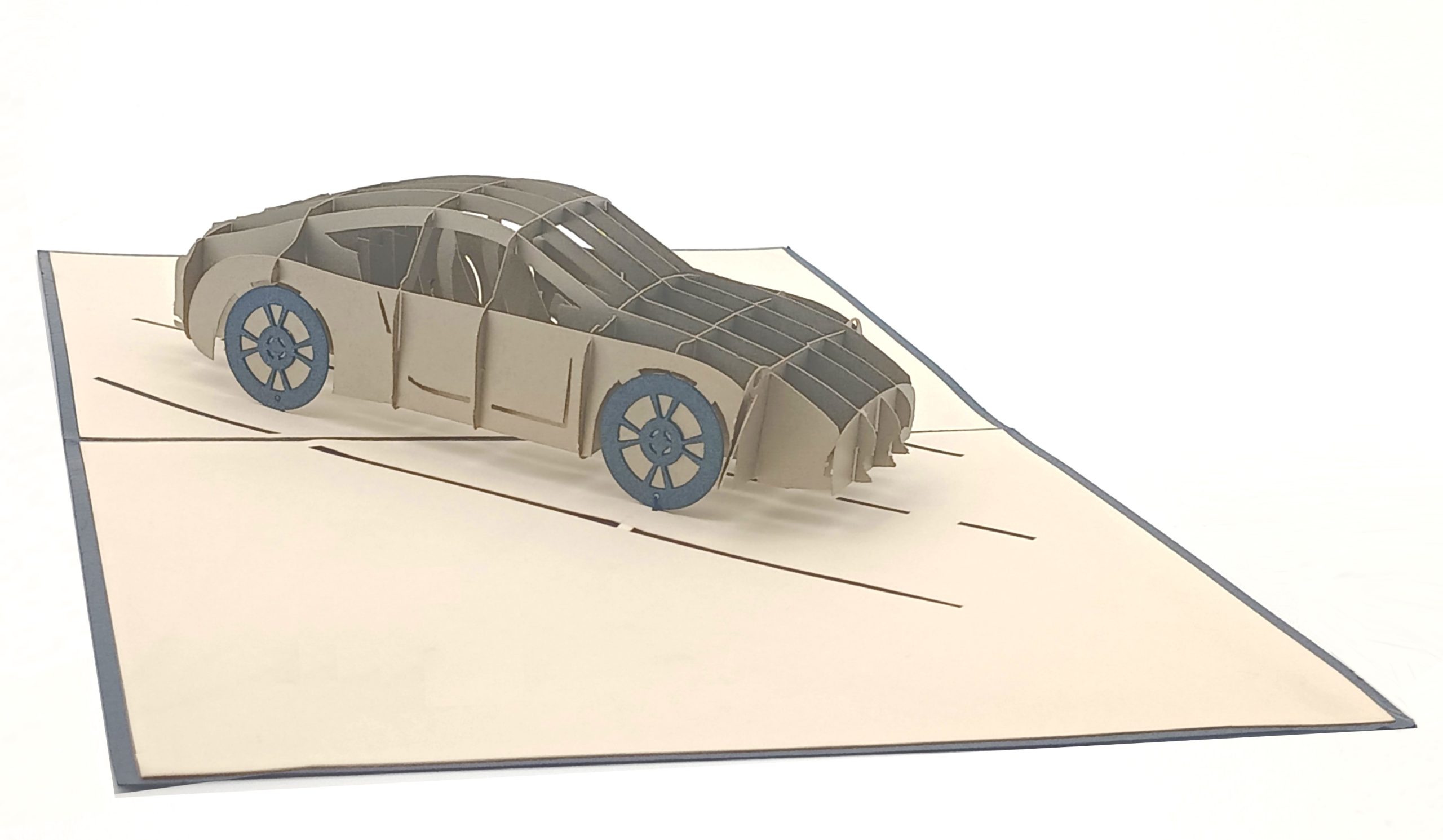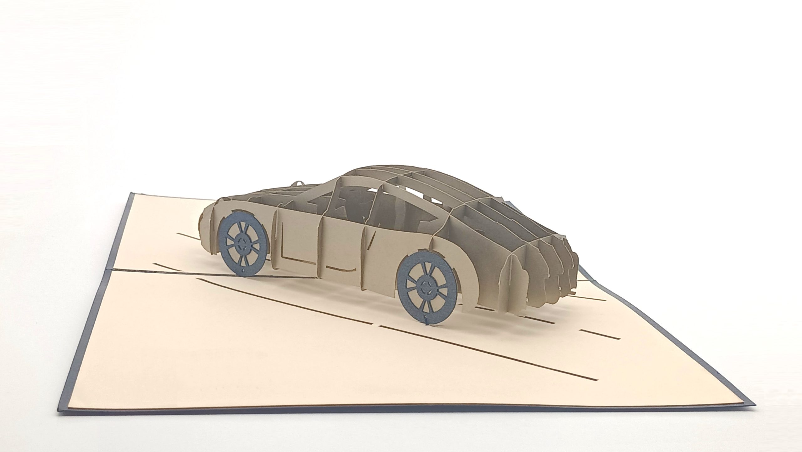 Esta llamativa tarjeta de gran dimensión celebra la elegancia y velocidad con la representación de un coche deportivo de color bronce. Al abrir la tarjeta, la escena tridimensional se despliega, revelando el esplendor y estilo del coche, con detalles meticulosos que capturan su diseño aerodinámico y el brillo distintivo del color bronce.