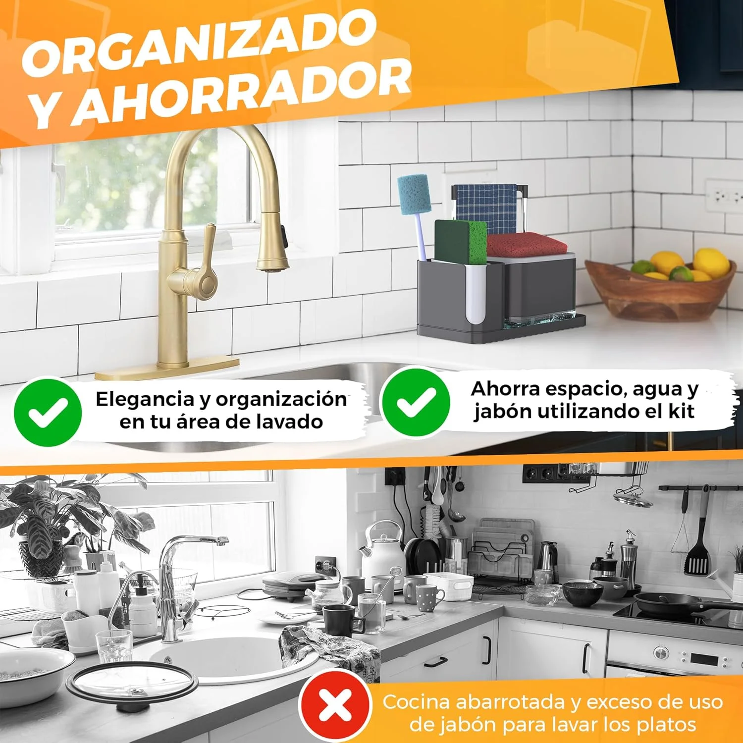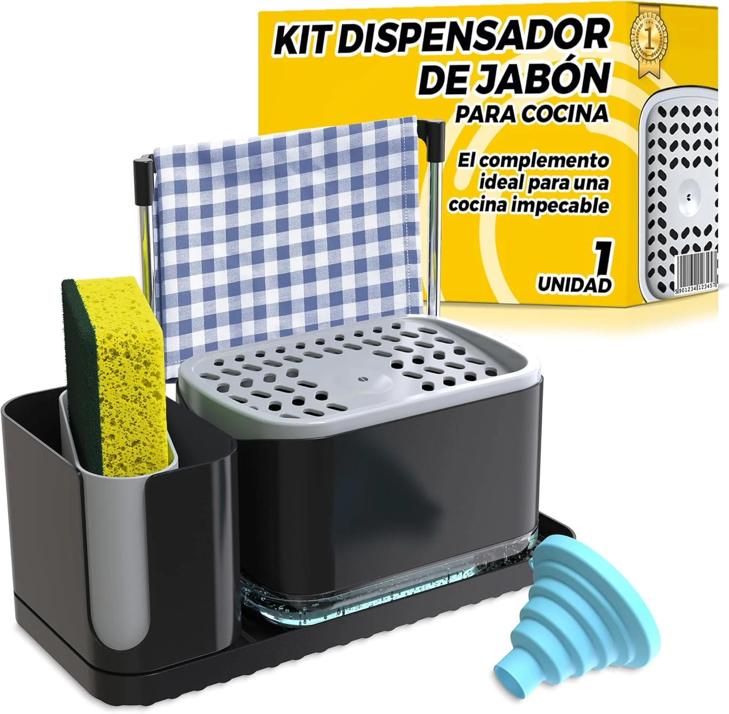 - DOSIFICADOR JABÓN COCINA EN COLOR NEGRO: Elegante dispensador de jabón cocina con diseño moderno y compacto. Ideal para mantener el fregadero limpio, ordenado y con estilo. Combina con cualquier decoración de cocina.