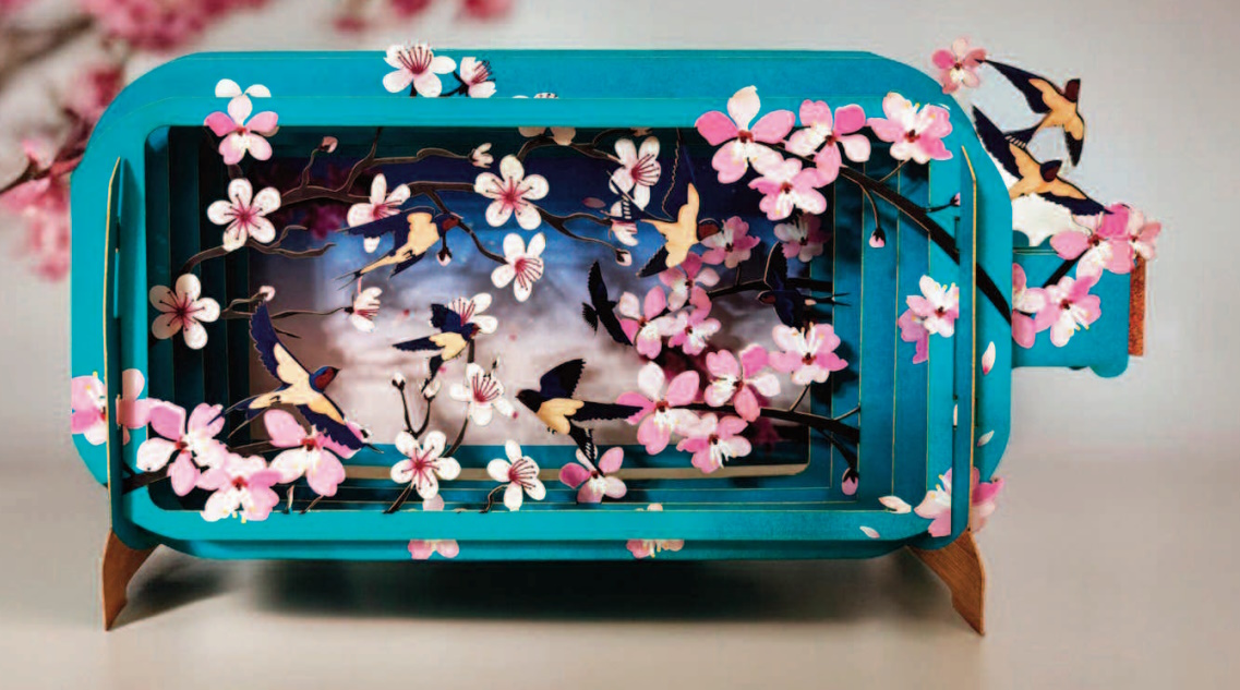 Siente la delicadeza de la primavera con nuestra encantadora tarjeta en forma de botella. A través de capas meticulosamente ensambladas de papel, esta tarjeta te transporta a un rincón poético donde la naturaleza se despierta a la vida.
