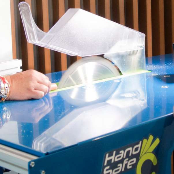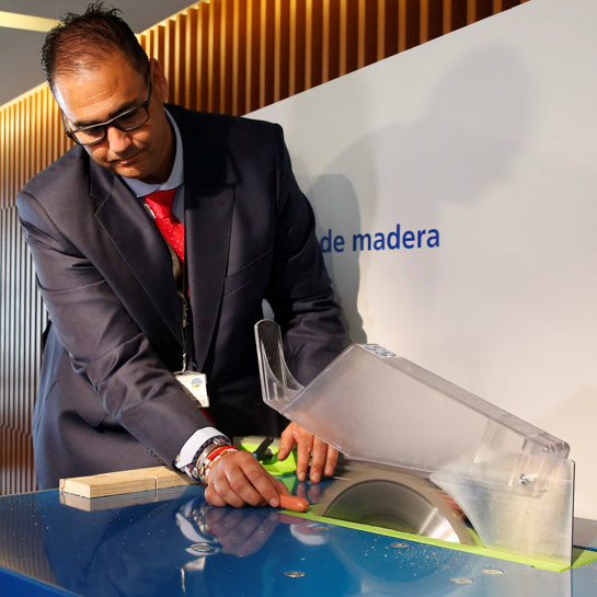 Este equipo, además de contar con los elementos de seguridad previstos por la norma, aporta un exclusivo sistema de seguridad que detiene el disco en menos de un segundo desde que toca la piel. Con ello se consigue reducir el daño en un accidente debido a un descuido o a un uso inadecuado de la máquina.