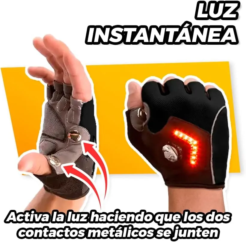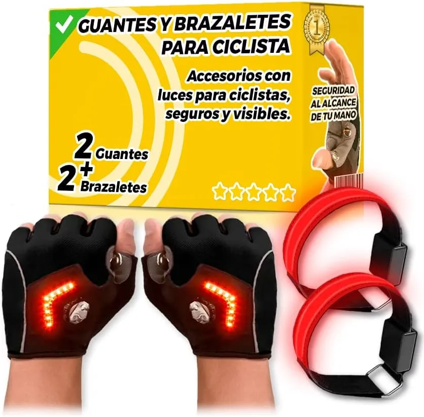 Kit para ciclistas compuesto por unos guantes que tienen unas luces leds para utilizar como intermitentes y que sirvan para indicar si vas a girar a la izquierda o a la derecha, además viene con unos brazaletes con luces, ideales para ser visto cuando vas en bici y disminuir el riesgo de atropellos por no ser visible.