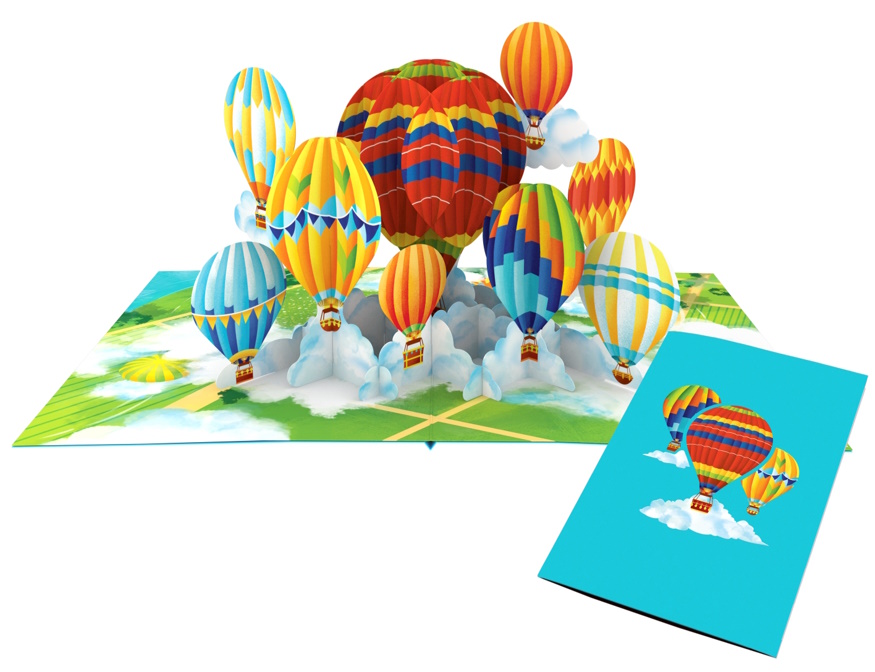 Increíble tarjeta pop-up que desborda de color y dinamismo, al representar una multitud de globos aerostáticos multicolores que flotan majestuosos sobre un paisaje impresionante.