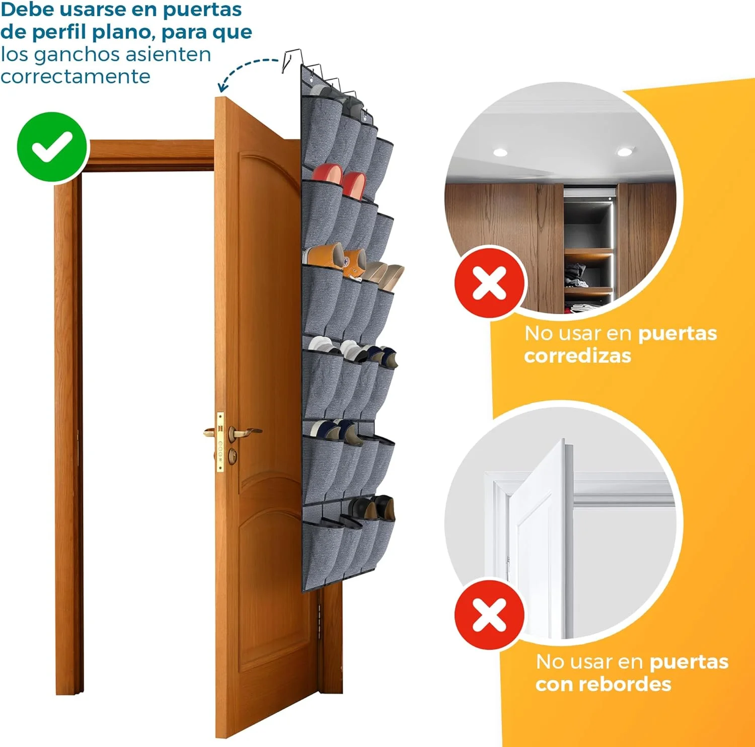 - INCLUYE GANCHOS METÁLICOS PARA FÁCIL INSTALACIÓN: Se instala fácilmente en puertas con los 3 ganchos incluidos. Perfecto como zapatero puerta, shoe organizer o solución de almacenaje zapatos rápida