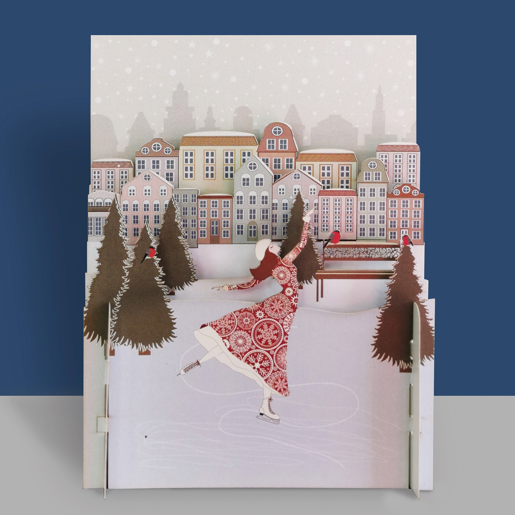 Celebra la temporada festiva con nuestra maravillosa tarjeta pop-up que captura la elegancia y alegría del invierno. En el centro de esta tarjeta, una bella patinadora con un abrigo rojo, decorado con estampados geométricos, desliza graciosamente sobre el hielo en medio de un parque invernal. La escena se desarrolla entre abetos navideños, creando un ambiente mágico frente a encantadores edificios de una ciudad.