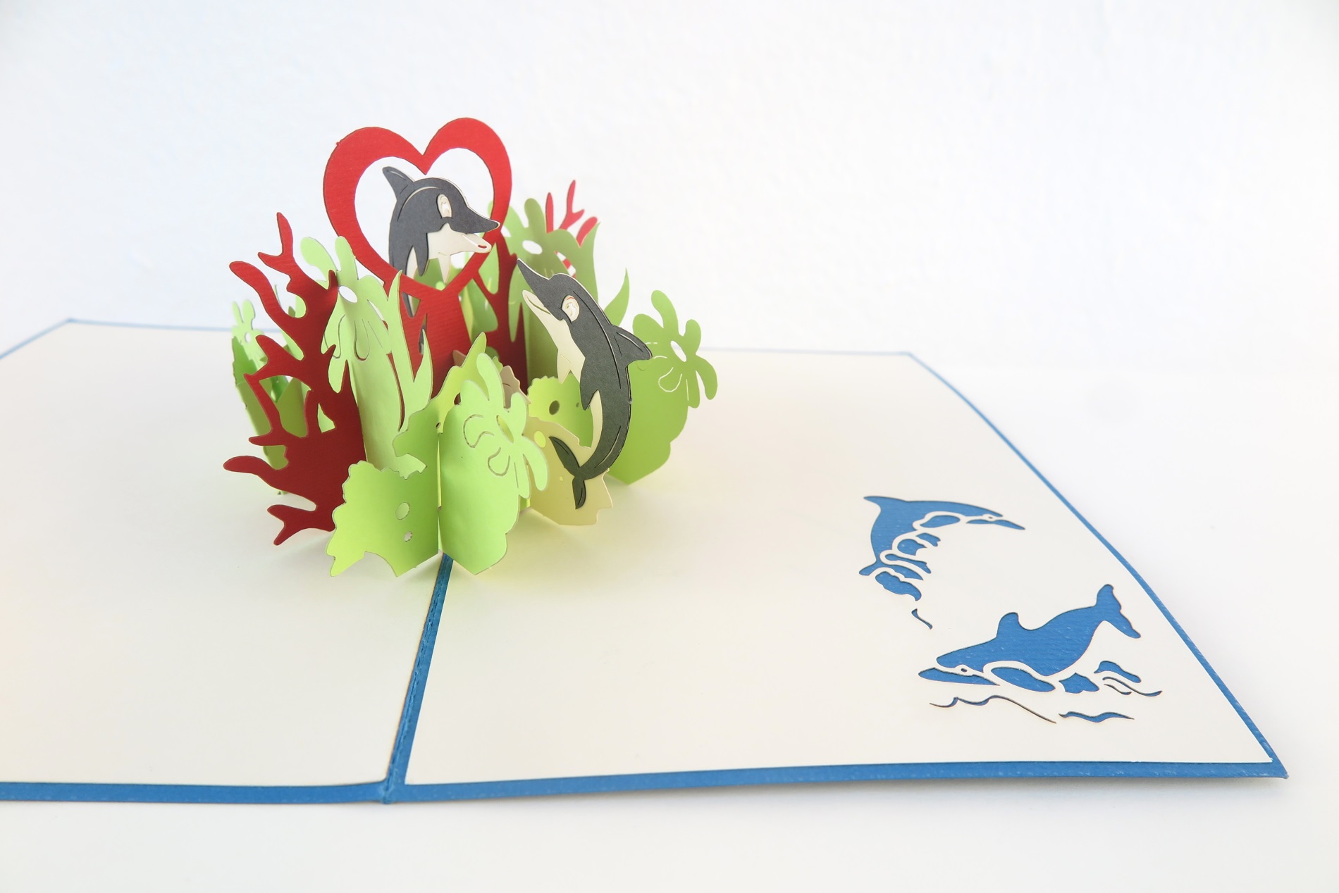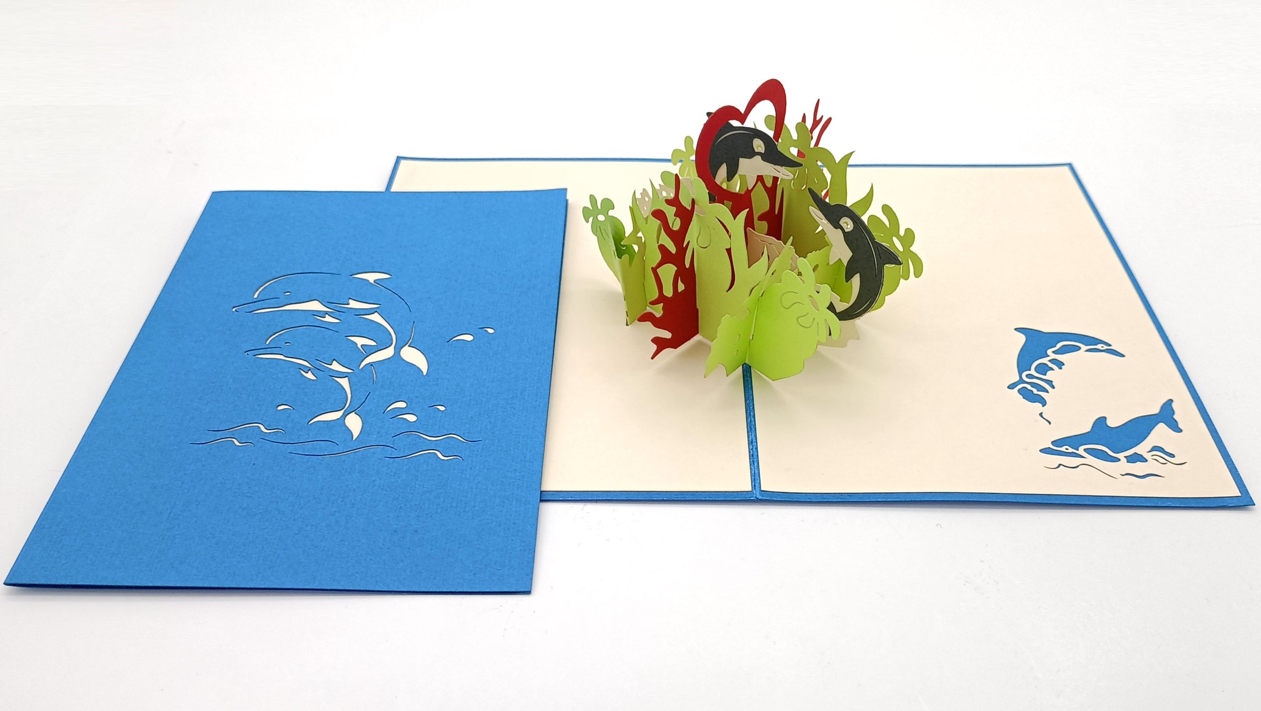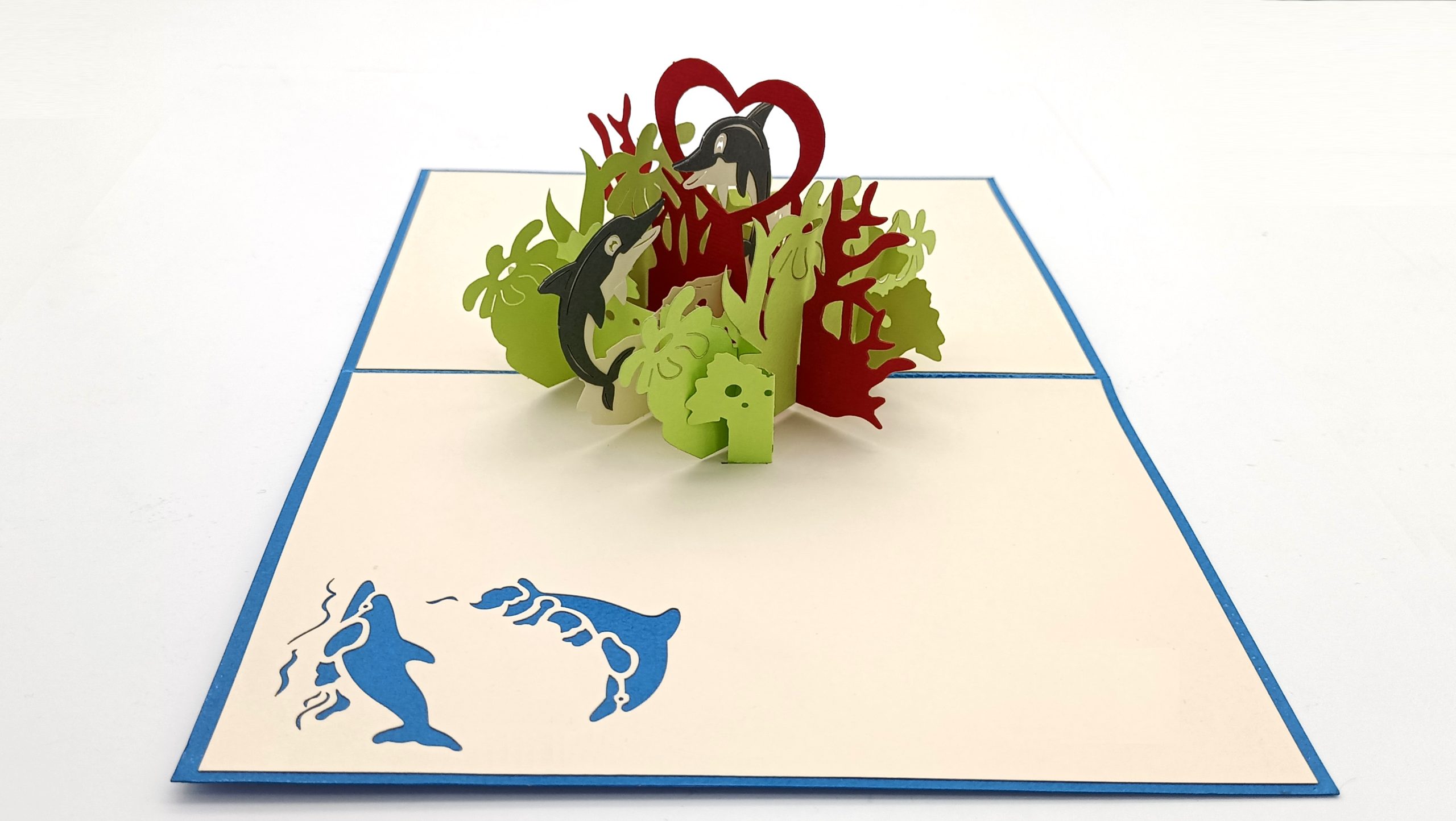 Esta encantadora tarjeta captura la gracia y la ternura de la vida marina con la representación detallada de dos delfines en medio de algas marinas. Al abrir la tarjeta, la escena tridimensional se despliega, revelando a los delfines que, de manera juguetona y cariñosa, tocan la punta de sus hocicos a través de un aro de color rojo en forma de corazón.