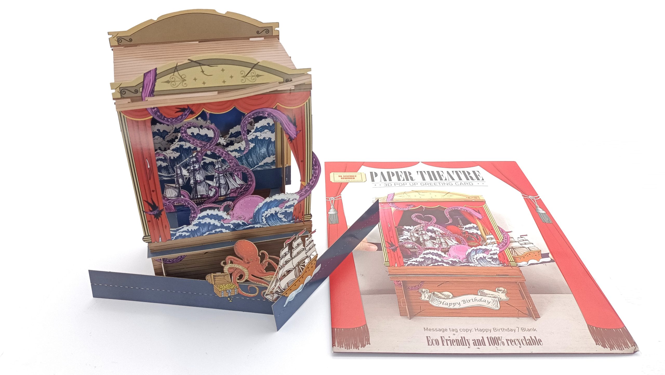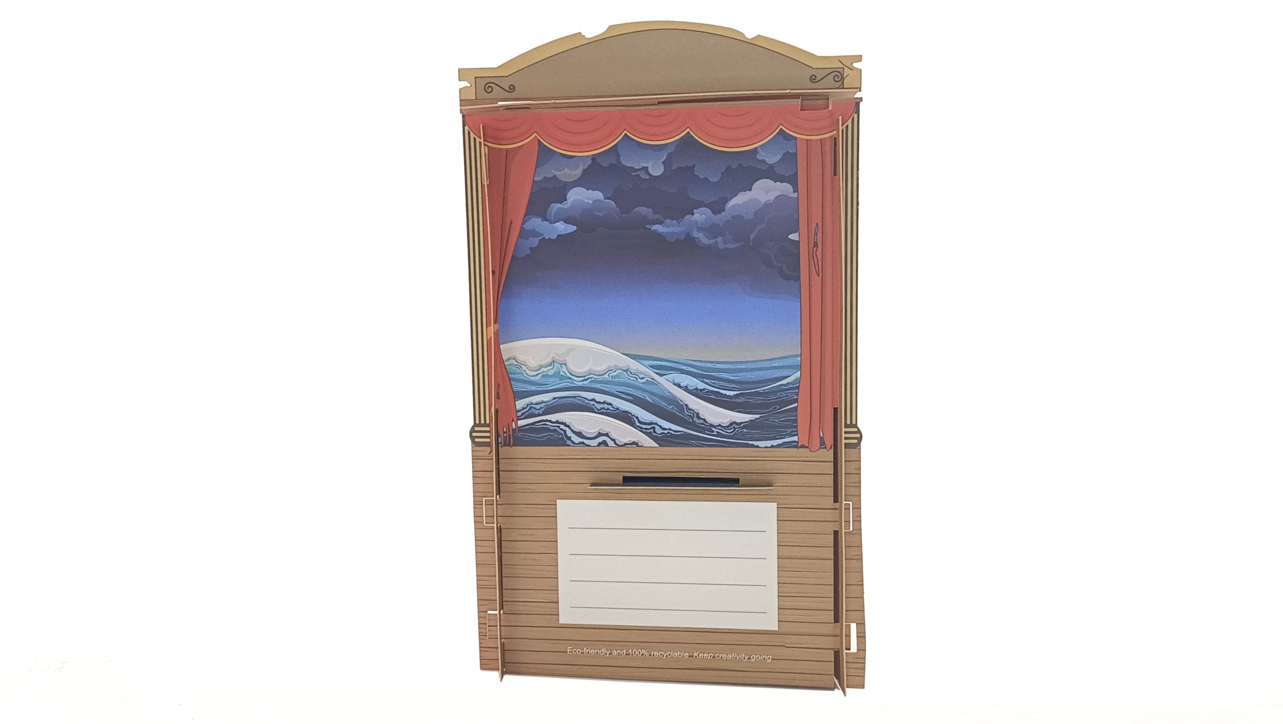 Sumérgete en la emocionante aventura de nuestro teatrillo desplegable en pop up. Este fascinante espectáculo en papel representa un galeón valiente enfrentándose a los tentáculos de un pulpo gigante en medio de un océano enfurecido. En el horizonte, un faro advierte del peligro de la costa, añadiendo un toque de suspense a la escena.