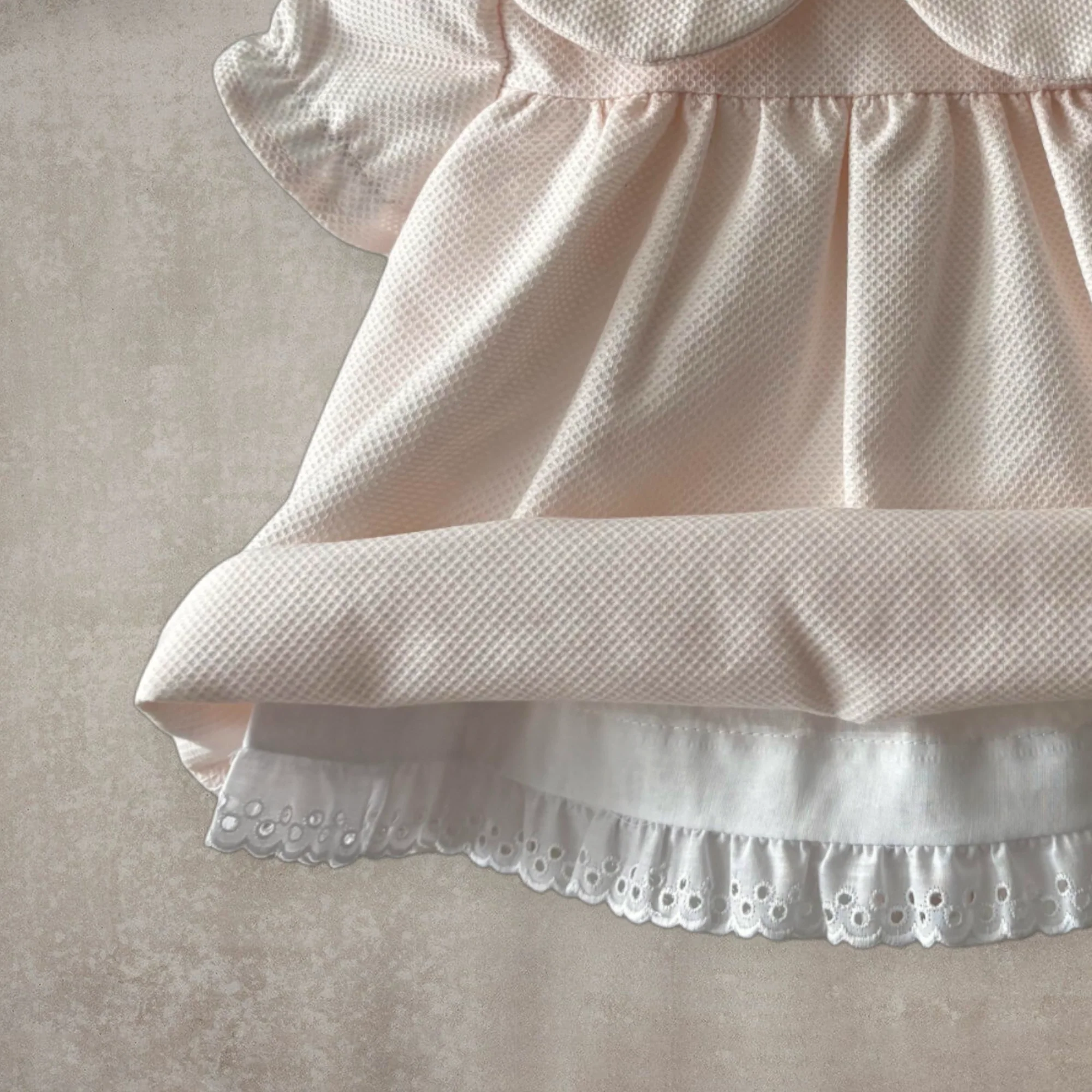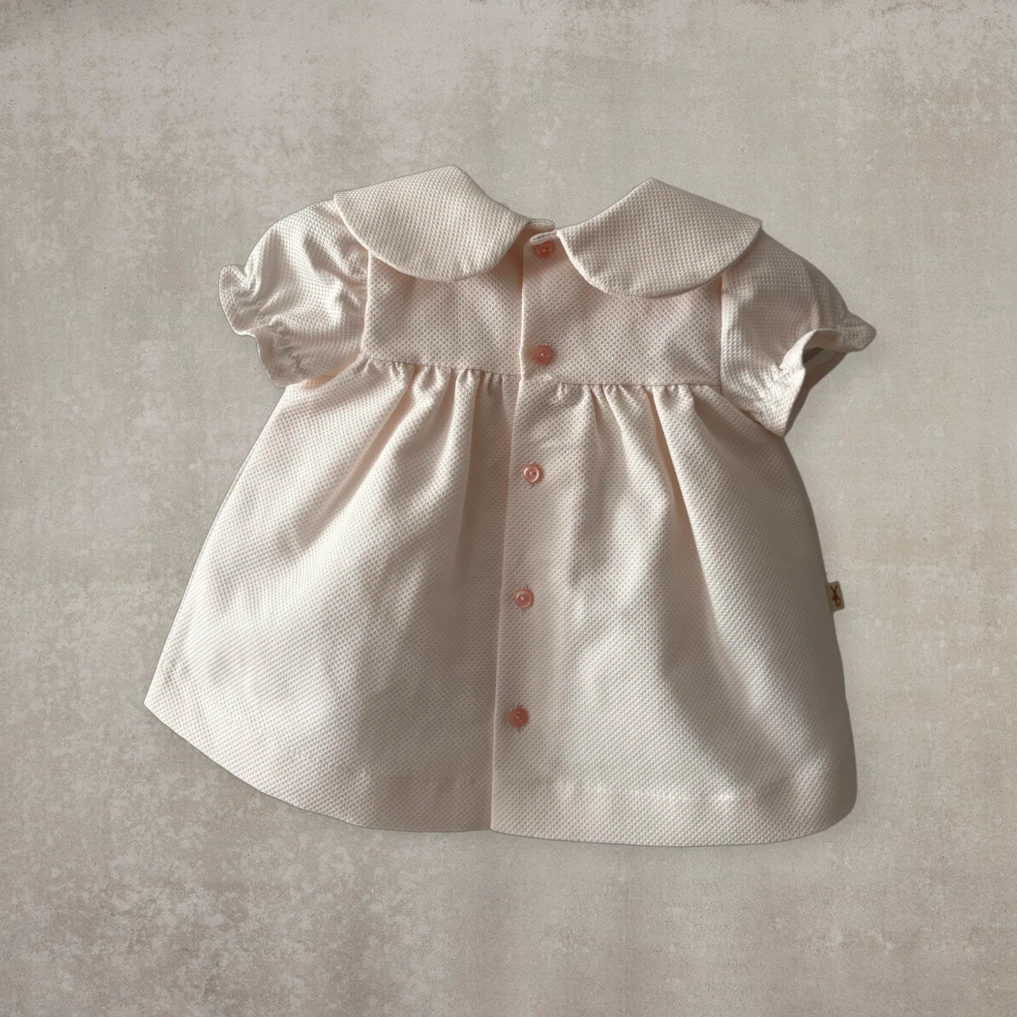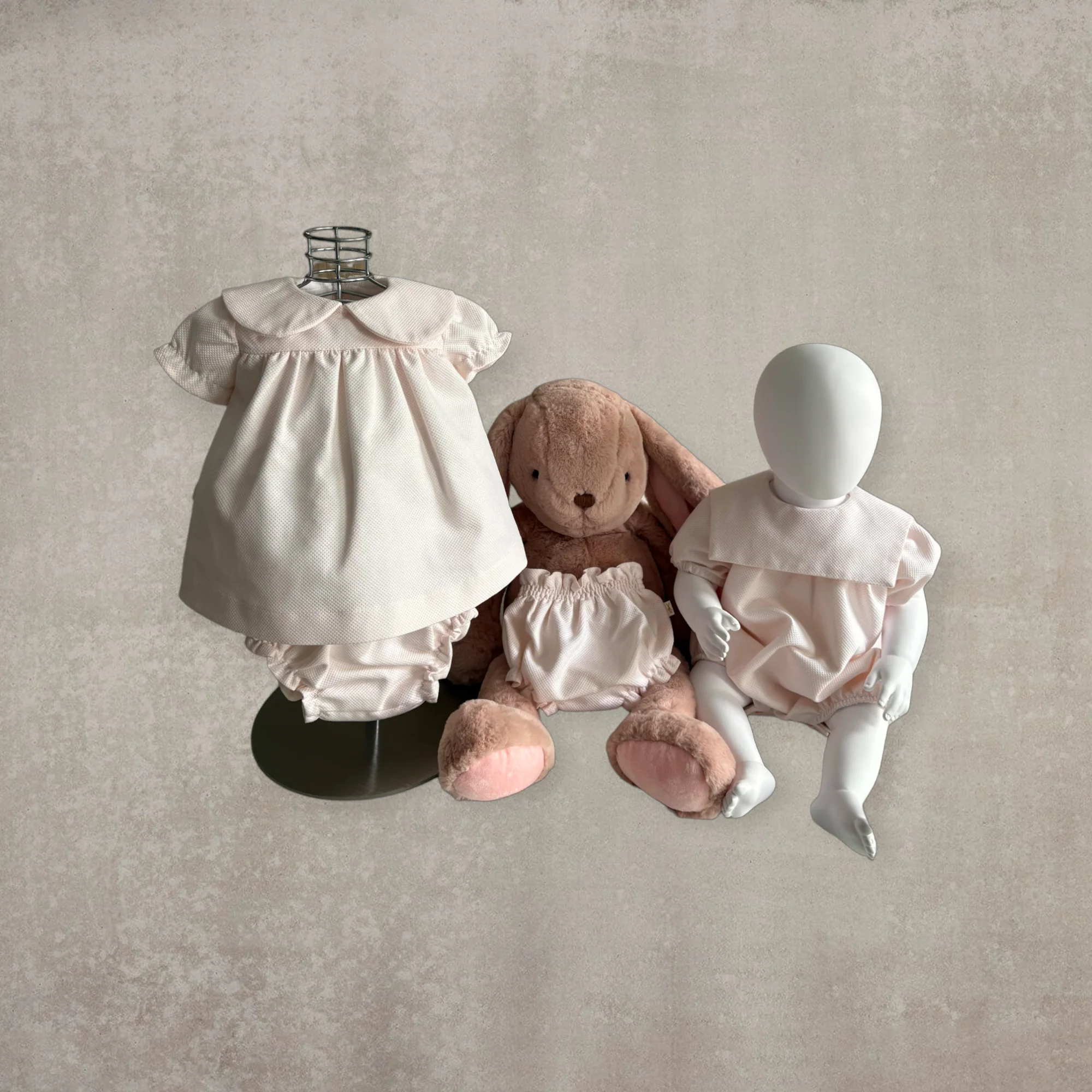 Conjunto dos prendas forradas formado por un Vestido con cuello tipo bobo, mangas tipo farol y botones a tono en la espalda. Braguita forrada con gomas en cintura y piernas que ofrecen un ajuste cómodo.