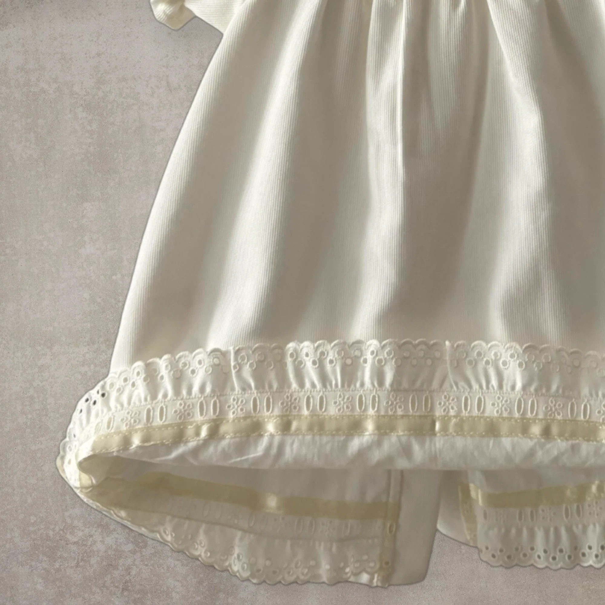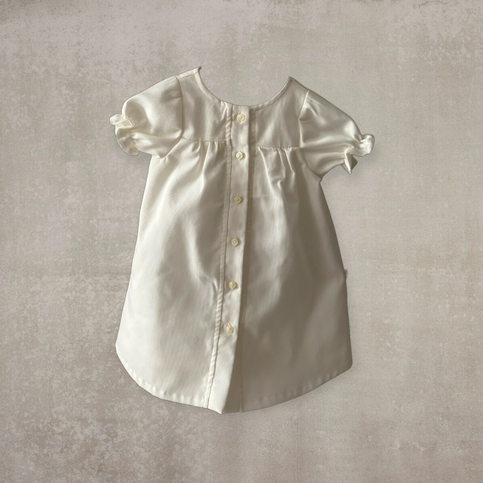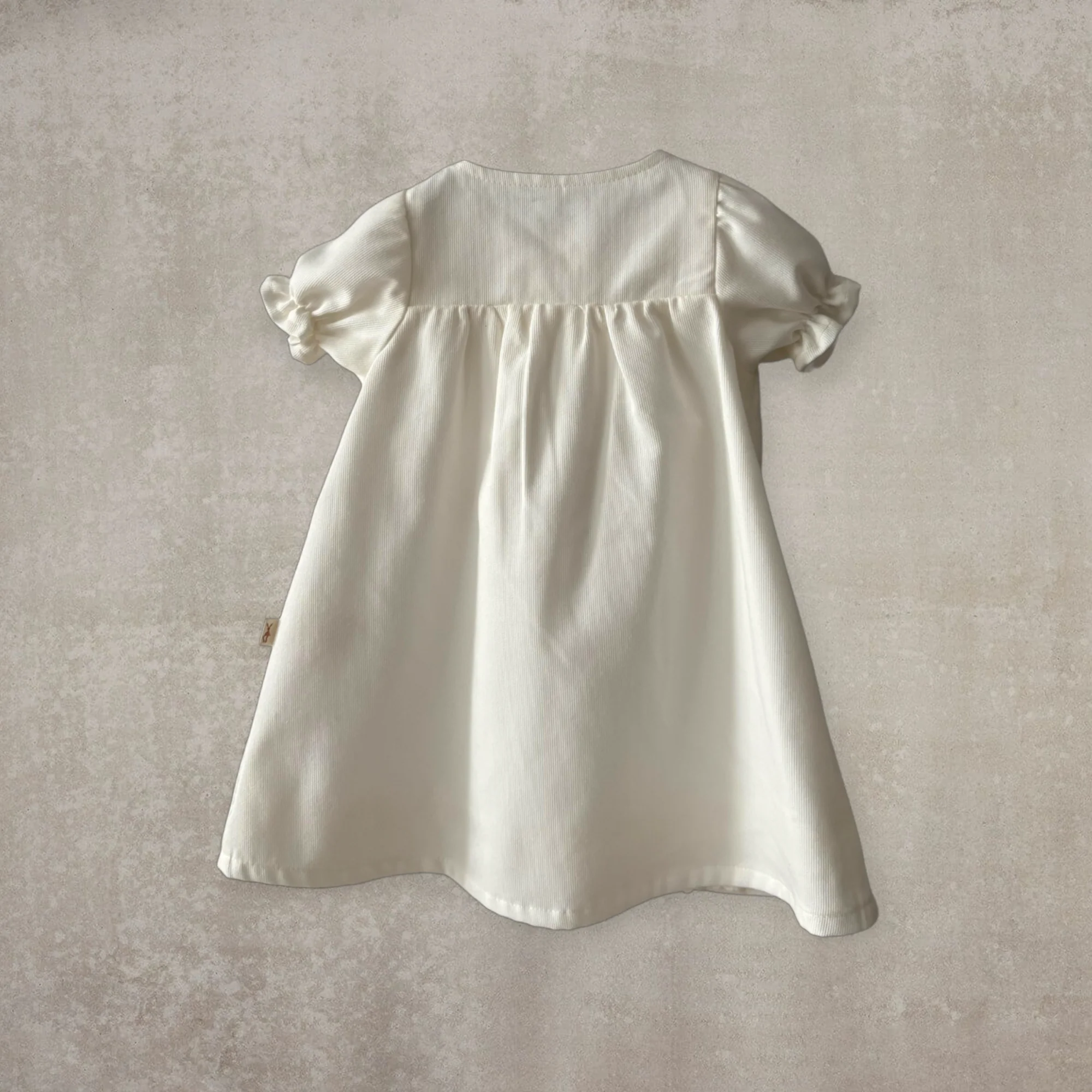 Vestido largo en piqué, forrado con una muselina de algodón y acabado con bordado, cuello redondo y mangas tipo farol.