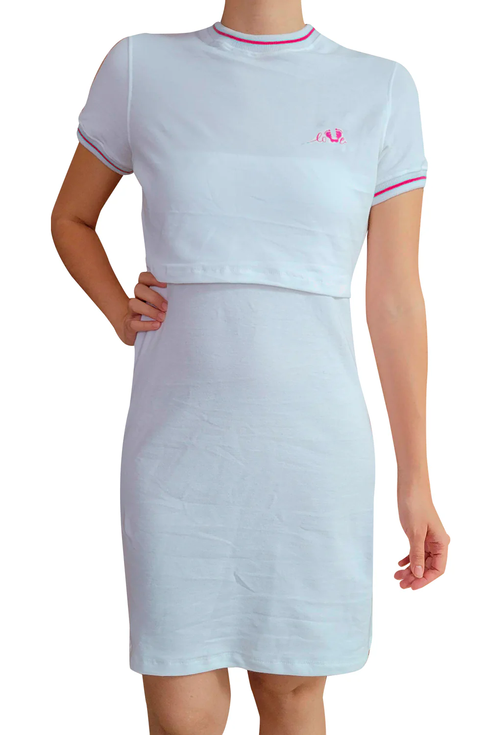Comódo vestido en tela piquet con cuello y polo deportivo, con sistema de abertura para facilitar la lactancia.